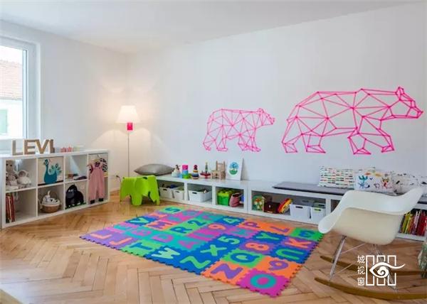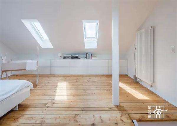 二楼的儿童房是其中最活泼的地方。但到了三楼阁楼中的主卧,又恢复到白墙和木纹地板的形式。