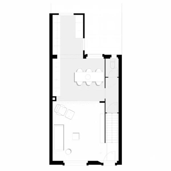生活空间主要在楼上三层,一楼从进门起是客厅、餐厅和厨房。这三个空间完全打通而没有隔间,遮住了房间面积不大的缺点。厨房在餐厅的后面,但橱柜从餐厅一直延伸到餐厅里面,使两个空间连接在一起,可以显得更大。地板也用了灰色的石膏面与客厅区别。