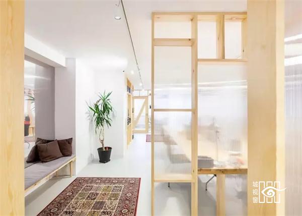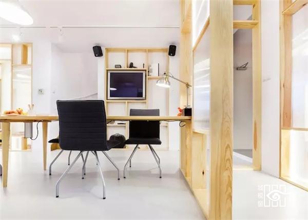一是清漆松木。它为房子搭起了整体内部框架,比如对于录制和音效编辑工作室、接待区以及会议室的区隔与布局。原木色系的大面积使用,为整个空间注入的,是清新自然的活力。