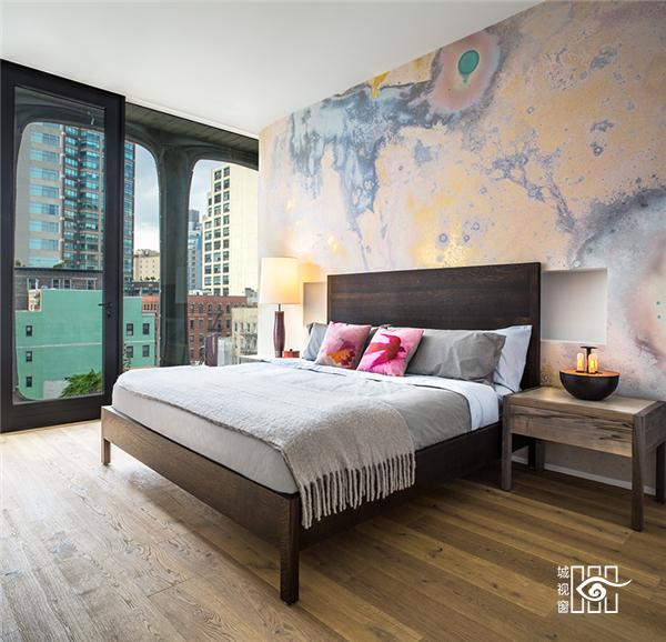 室内的层高有 3 米,事务所还找来了一些艺术家来设计室内装饰,床头、浴室的墙面和一些家具的表面都有意使用云纹或石头,让房间很有雕塑感。