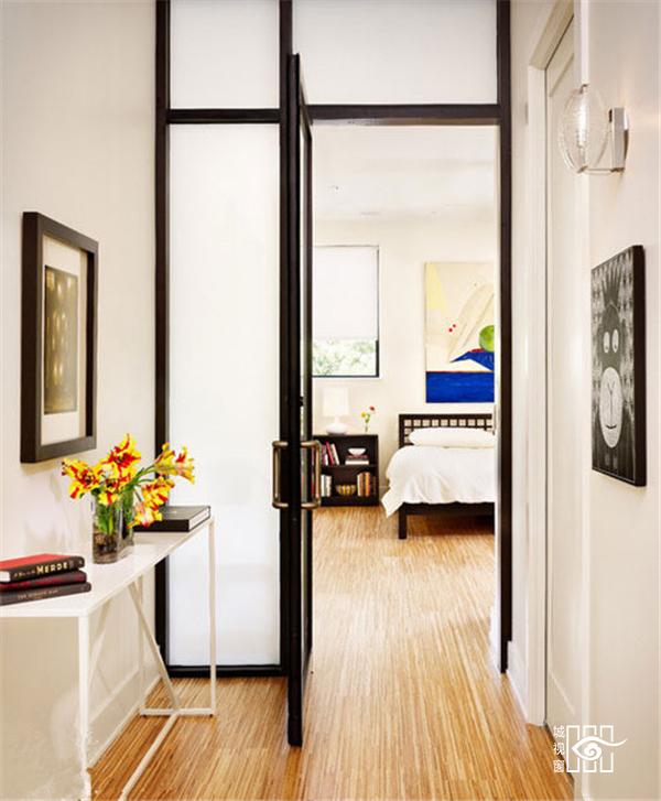 巧设门作隔开空间,进门的玄关区域,正对的是十分少见的卧室空间,而隐蔽的卧室空间,自然要想办法进行“保护”。