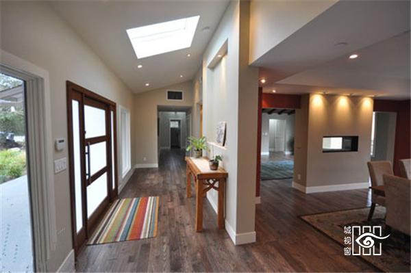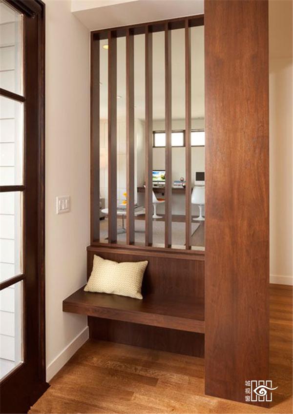 加上玄关坐的木隔断,可以在进门处适当保留室内空间的隐秘性以及突兀性,案例中的玄关,创意地将隔断与坐凳合为一体。