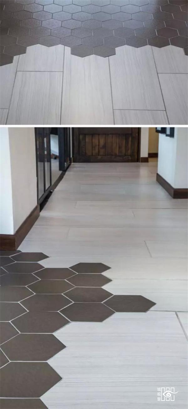 3.六边形瓷砖和木质地板拼接。