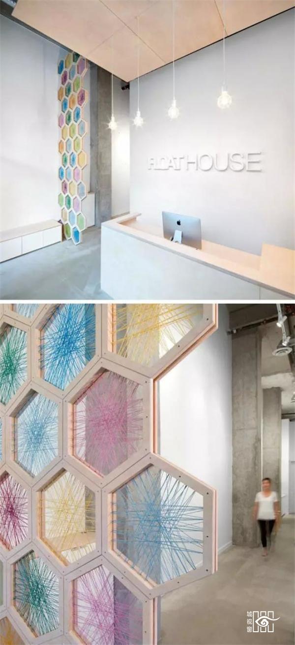 6.温哥华FloatHouse公司接待室旁边的隔断,用彩色线编织的白桦木六边形屏风,彩色的六边形屏风刚好能带来活力和俏皮的感觉,就像用蜡笔画出来的,很可爱。