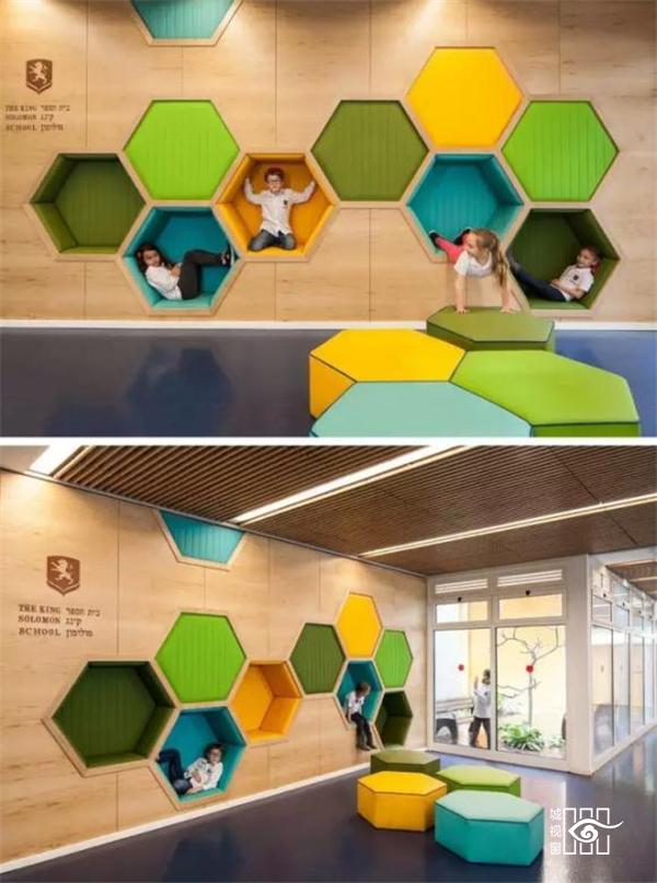 5.彩色六边形吸音板,冲撞的颜色,很有立体感。
