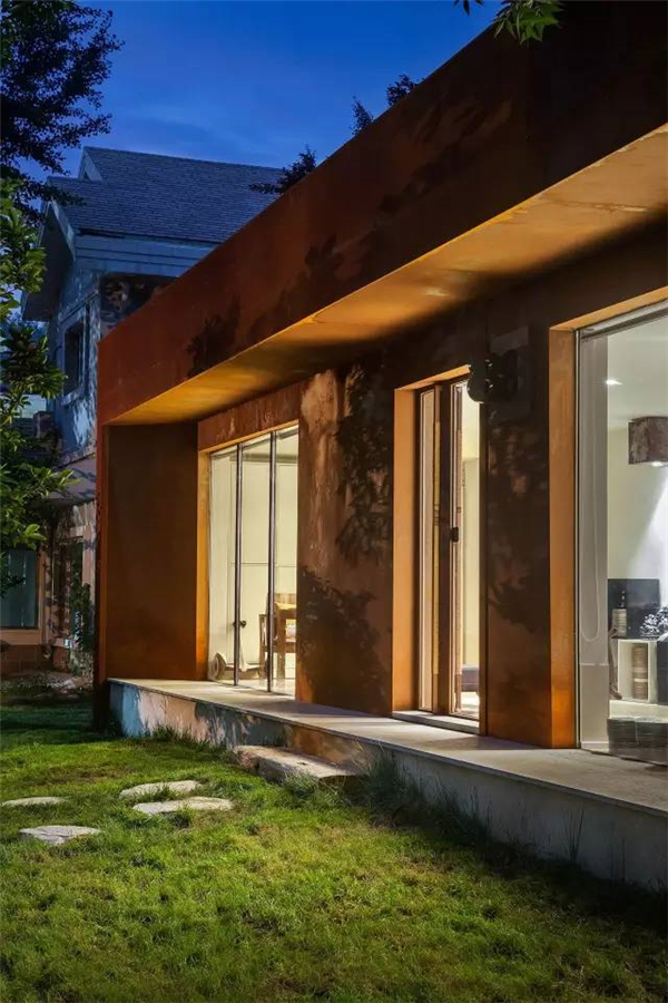在老建筑中有块橘红色的区域,当保留的原始建筑面积足够大时,会体现太多的破败感,所以设计师崔树团队将代表他们品牌的logo色加了进去。强烈的颜色冲击,折射的却是一个影视团队的蓬勃激情。将原有的楼梯区域拆除,改到建筑之外,原来的位置做了玻璃盒子的通廊,休息区与主卧室之间连接在一起,新旧之间的对比自然形成气质美。