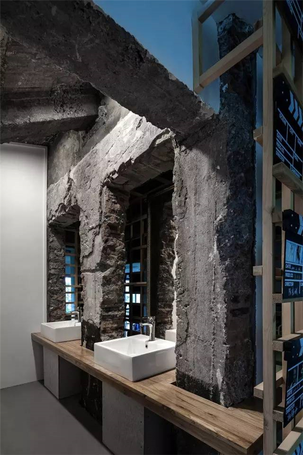 卫生区域保留原有的粗矿表面,将洗手台墙体往里推了一个尺度,镜子内嵌其中,形成对称并有在窗洞里洗手的感觉。窗洞之外设计师崔树团队做了个框架将它包裹其中,一面是它的洗手台的同时也面对着他们以往做过的项目。