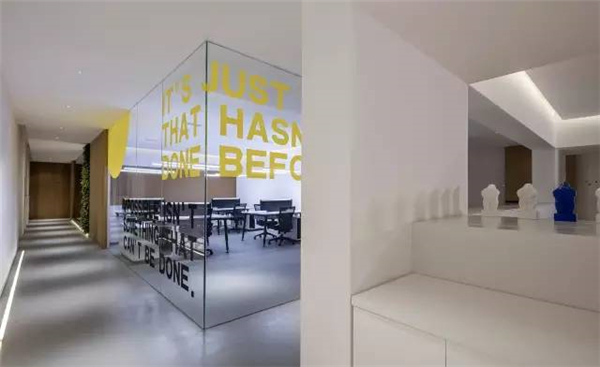 这样整个建筑里,顶面是不会有任何一根电线的,还原最纯真的原始质感。因为他们是一个影视公司,所以他们的导演都喜欢躲在一个小角落里,去创作一些自己的想法,所以设计师崔树团队做了些阳光板的小区域,在这个区域中别人不会看到你在做什么,但是有朦胧的光影影影绰绰映射进来,形成独立的思考的空间可以去创作无限的想象。