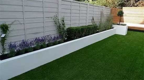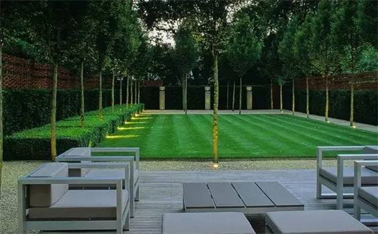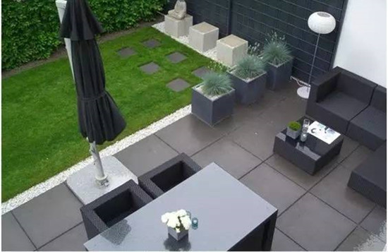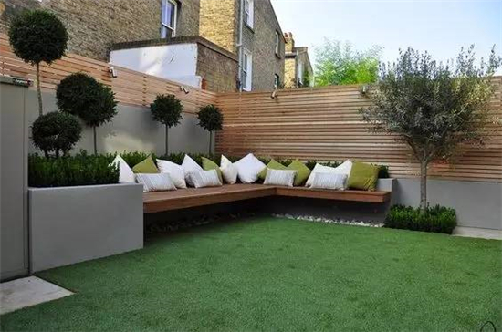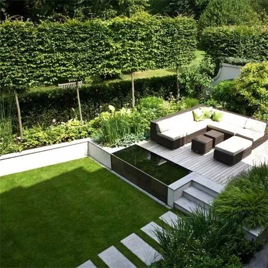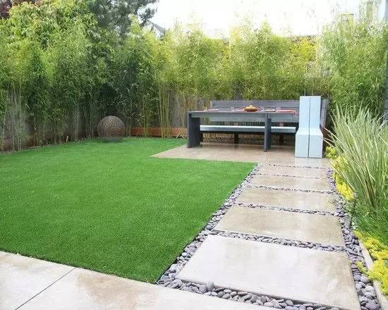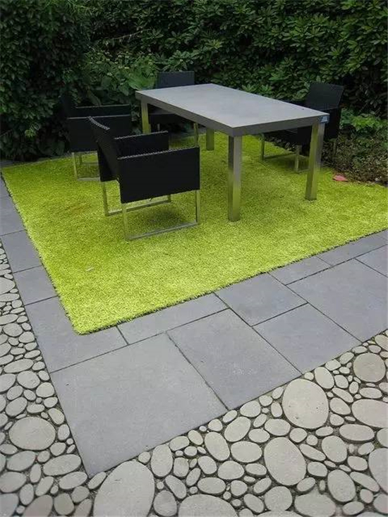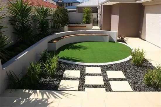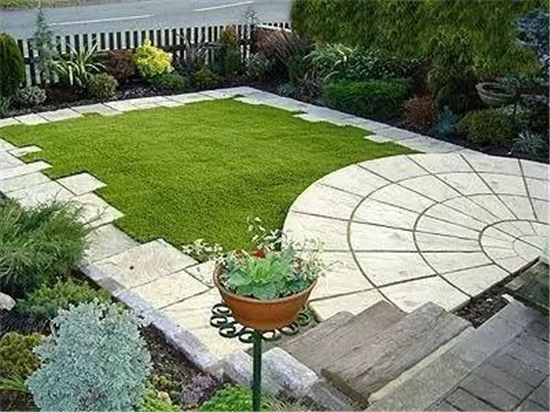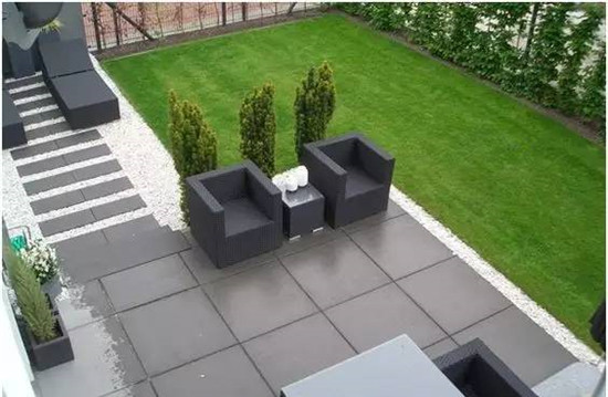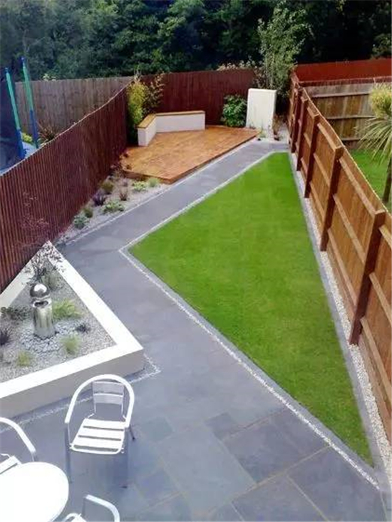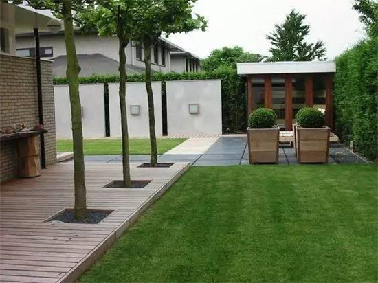 如果要保护好修整过的草坪,在硬装上可以是木质平台和水泥地砖