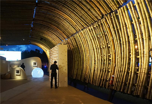 竹条地从地面向天空温柔延伸,形成温馨展区的屋顶