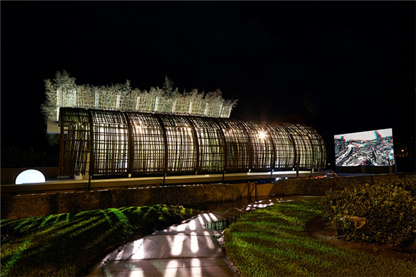 夜晚灯光照亮该装置作品,在很远的地方也能窥探到一撇魅影