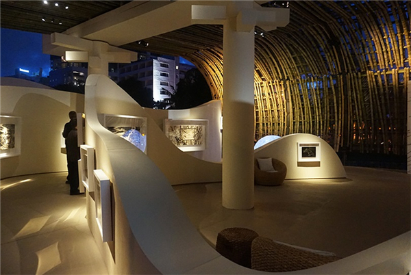 竹条屋顶下是一个温馨的展览空间,供展览的有各种木刻版画作品