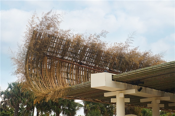 弯曲的屋顶由1300根竹条搭建而成,屋顶位于介于21号街、22号街以及迈阿密海滩之间的海边空地上。竹条地从地面向天空呈S形温柔延伸,形成一个温馨的展区。黄昏后,灯光照亮这里,温和的色调温暖着每一根竹子,反佛一座海滩和远方的灯塔。艺术家描述作品说:“我从自己多年的创作经验中寻找灵感,通过与100多名艺术学生团队的合作来实现该艺术作品,我很高兴,只是经过短短一年,作品已经从图纸变成真正存在的实物作品。”