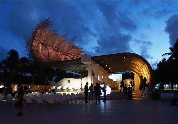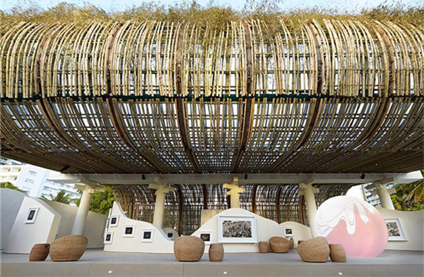 在迈阿密艺术周期间,中国艺术家Xun Sun创作了一件大规模竹子装置作品,充分展现了传统工艺和先进技术的完美融合。该作品由瑞士手表制造商爱彼年度艺术委员会陈展,作品名为《宇宙的重建》,是一件涉及领域广泛的项目作品,它呈现了一个令人身临其境的环境,竹子、建筑、雕塑和听觉元素构成了这里的环境。在馆外播放的3D动画电影由艺术家Xun Sun拍摄,短片名为《时间间谍》;馆内是一个展览空间,展出有传统卷轴画、墨水画以及球形灯光投影作品。