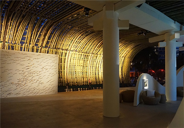 竹条地从地面向天空温柔延伸,形成温馨展区的屋顶
