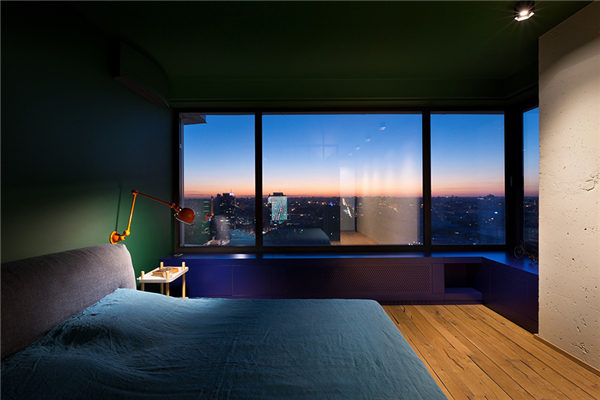 卧室延续了空间整体的格调,绿色的墙面,蓝色的飘窗柜与原色混凝土墙,相同的装饰元素一方面可以带来互相呼应的和谐感,另一方面也可以减少元素过多带来的杂乱与压抑性,橙色床头灯成为空间亮点,小面积的点缀却轻松提升空间的活力感。