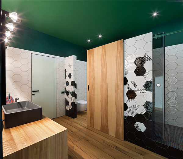 洗浴空间十分的宽敞,大量的木元素与绿色天花从外部延伸至此,黑白搭配的瓷砖营造出清爽洁净的氛围。
