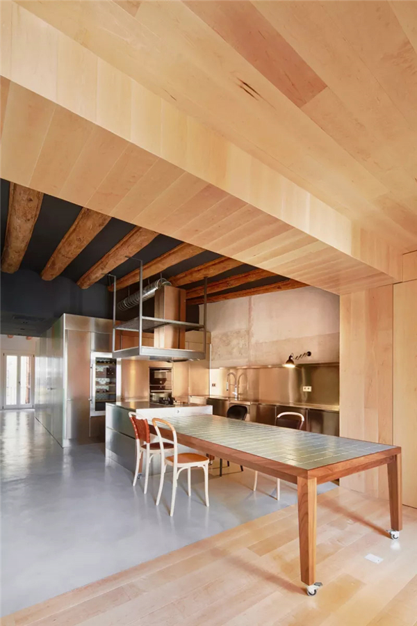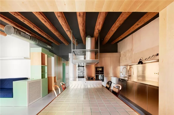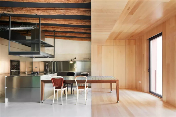 业主的要求是打造工业又温暖的风格。连续的走道和在公寓主要空间内不锈钢的使用,与光线最充足的 “木屋”起居室形成对比。