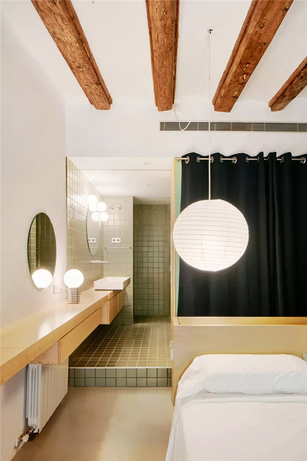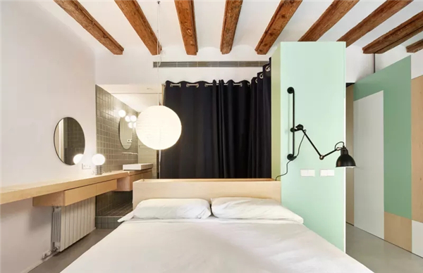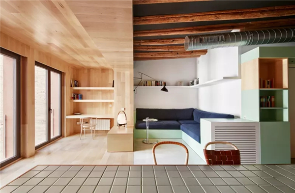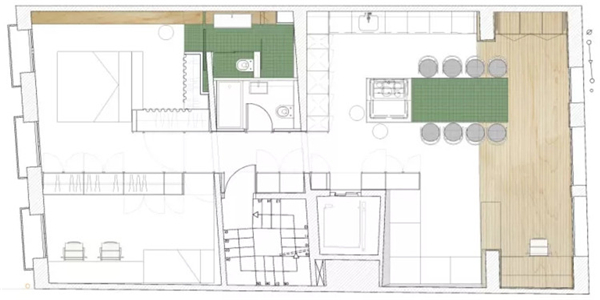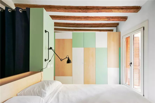 “隔板”设施不仅能分割出走道,还能作为白天和夜晚区域的连接点,且具有多功能用途。这是一个有效且动态的区域,此区域和公寓的其他空间利用了不同的材料以及色彩,例如白色树脂和绿色杉木的对比。