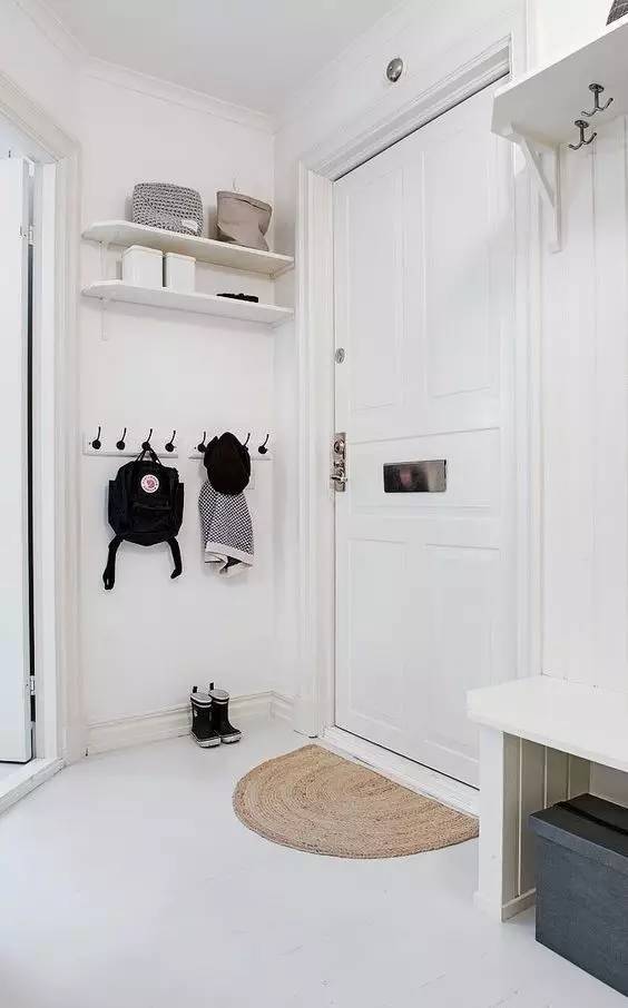 衣帽钩是玄关处的第一要素,解决了每日的脱衣穿衣问题,还顺带解决了钥匙挂哪斜挎包挂哪的问题。很多人家中的衣帽钩距离玄关处较远,造成很多不便。鞋子应该是进门就脱掉的,外套也应该是进门就应该换掉的,都应该在进家门的第一步以内区域全部解决。