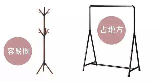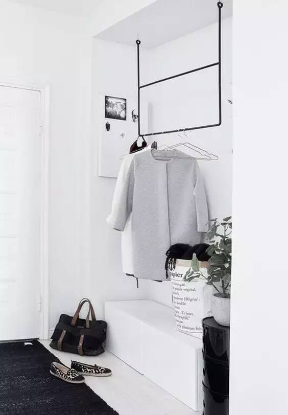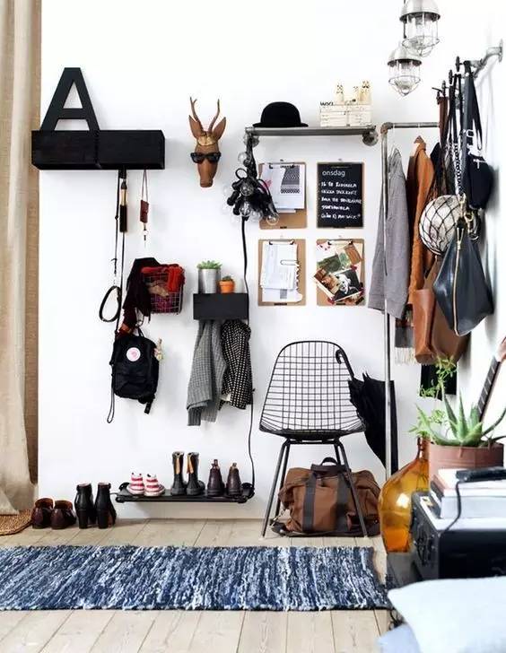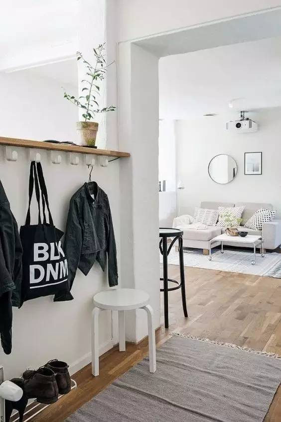 我们寻找并分析了很多玄关的奥妙之后,得出一个结论,即:在一平米的地儿,无论是立棍式衣架或落地衣架都不适合放在玄关处。容易碰倒,还显得杂乱不堪。如果你家的玄关地方够大,放什么都好啦,放个衣柜都是可以的。如果你家不大,玄关处就钉衣帽钩吧,不占地方,简单明确。