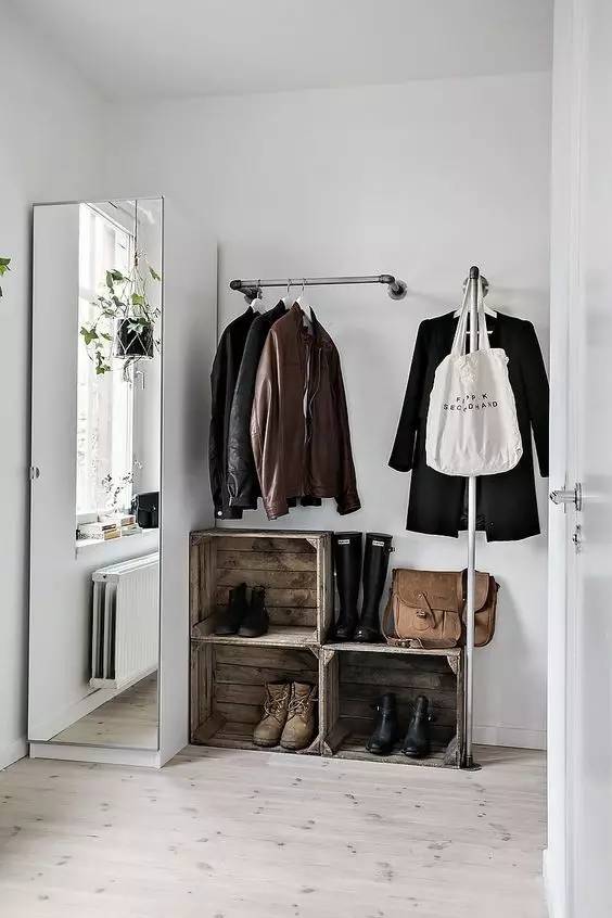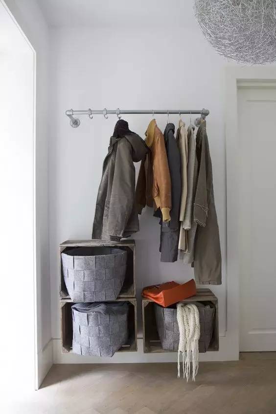 一点非正统的文艺小做法:水管衣帽架 + 运输用木盒 ,工业气质满分,前提是你不能是蜈蚣精。