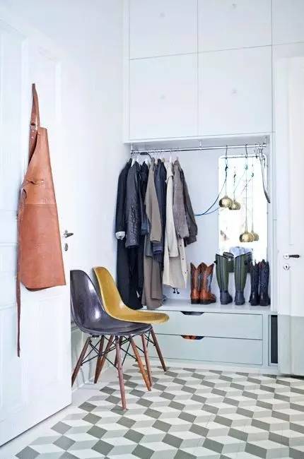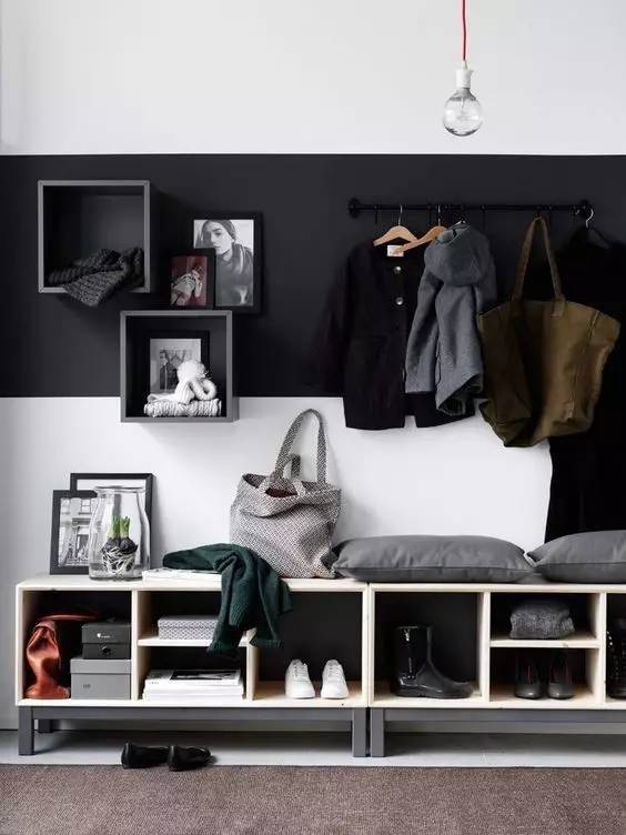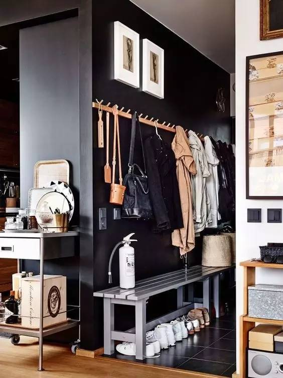 用颜色分区:给衣帽钩处刷上跳色涂料,可以把本身有些杂乱的地方显得更规则。