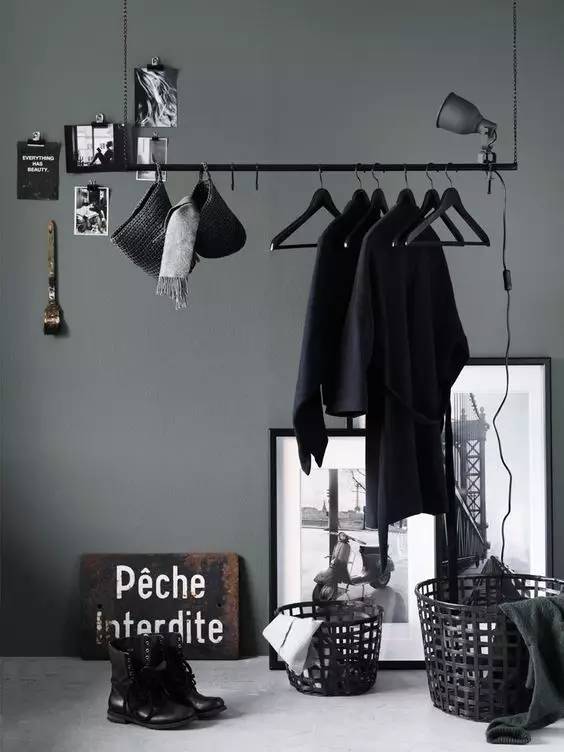 还可以考虑这种 悬 挂 式 衣 架,好处是比起墙上的挂钩,这种会更好的保护衣服本身的版型。