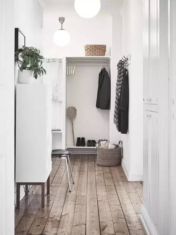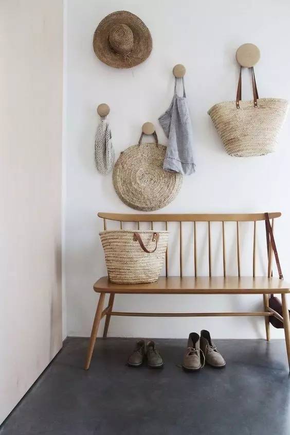 大衣是有位置挂了,可是冬天零零碎碎的衣服都放哪呢?在门口放一个 藤 编 筐 吧。对于有进门需要全脱光换上家居服的人来说,这是必不可少的。