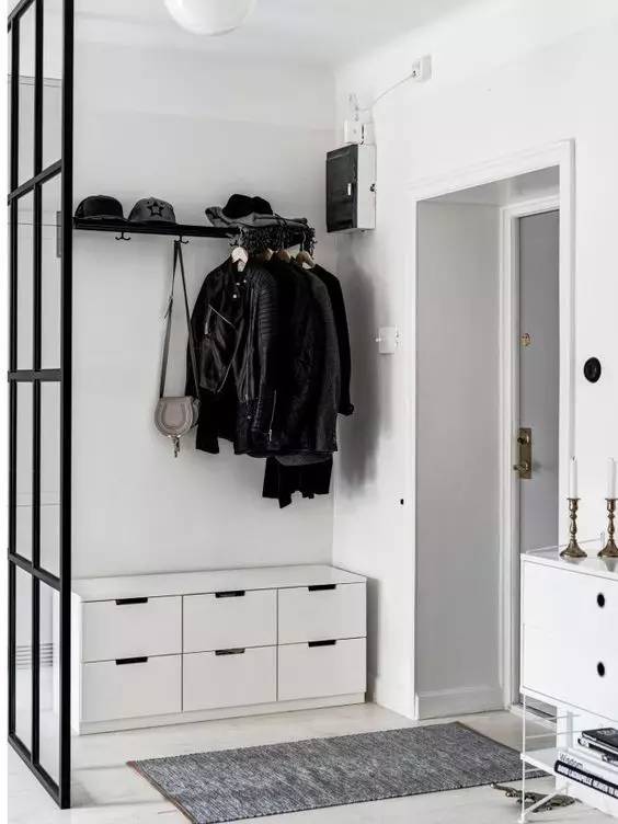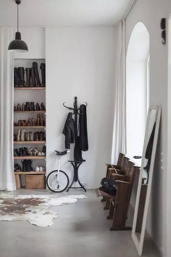 鞋柜在玄关处必不可少。传统的做法是买这样一个鞋柜,可以把所有鞋子都放进去,并且 高 度 正 好 的 鞋 柜 ,可以当个拖鞋的凳子来使用。这家主人还在门口装了一面“透明现代屏风”,不仅把冷风隔绝在门口,而且显得非常透气。