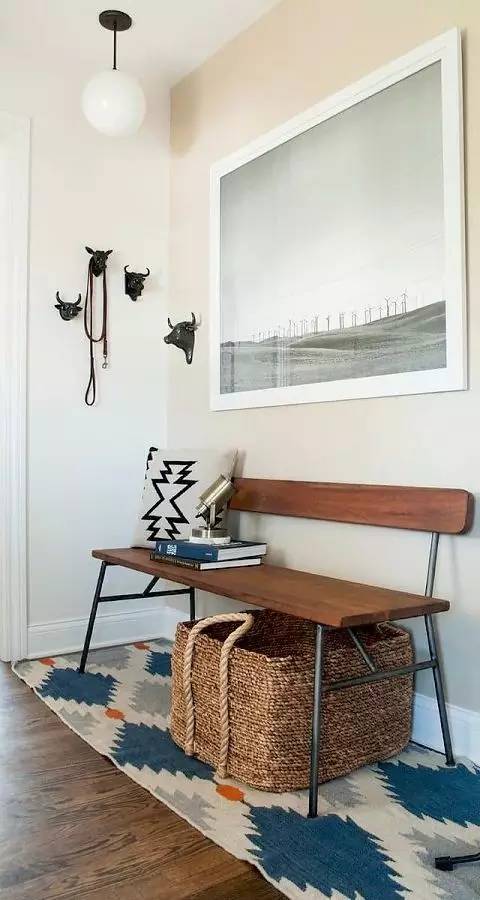 门口有个凳子非常方便换鞋,我是有老物件儿情节的,尤其是姥姥家的 老 条 儿 凳 。这样一把条凳摆在玄关处,与周围的现代家具一点也不违和,却衬出满满地对生活的热爱。