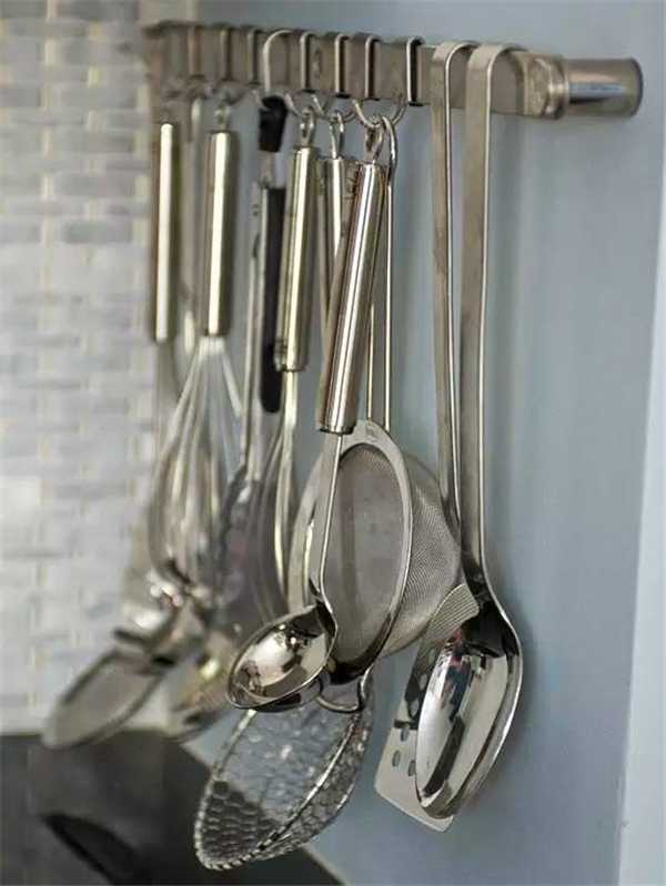 在网上淘一些s形的挂钩,一边勾在横杆上,另一边勾住厨具的环圈,简单省力,特别省空间。