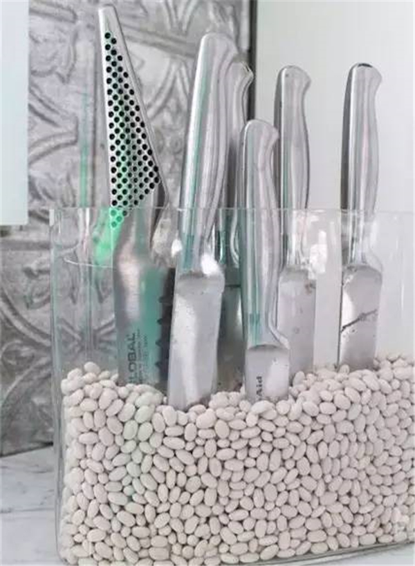 玻璃杯也能盛放刀具,将大一点的玻璃杯里放入小粒的干净鹅卵石,刀具用过后插在鹅卵石里,看起来还是很艺术呢~