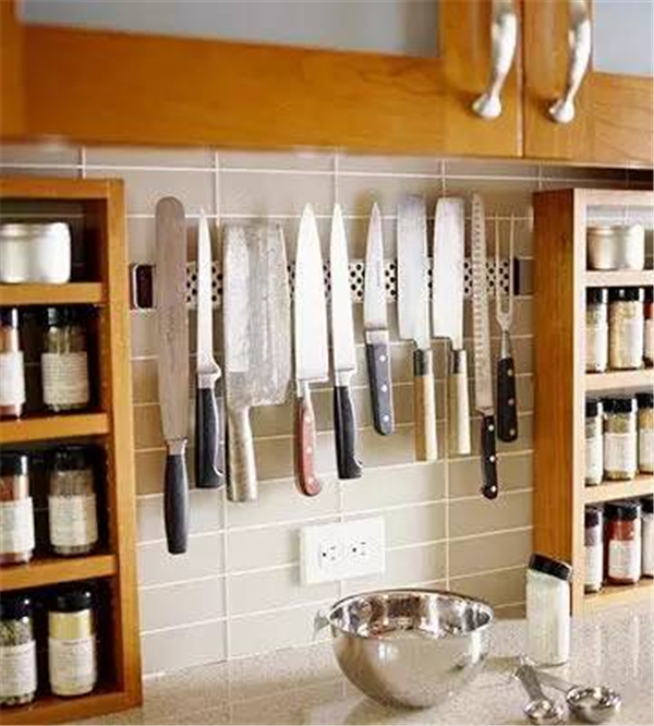 磁铁用在厨房里,绝对能够发挥大用处。将磁铁条钉在墙上,刀具会不由自主地被吸引过去。