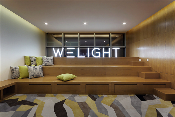 设计师在发挥建筑空间本身特有的极佳采光性与通透性的同时,运用大体块的材质碰撞及结构穿插,用简洁的设计手法表现空间张力。那么,在黑白灰的对比下,加入温暖质朴的原木色,赋予了空间温和的质感,同时将色彩明快的黄色与蓝色作为点缀,十分醒目,传达了微光创投生机勃勃、充满朝气、活跃于资本市场的企业形象。