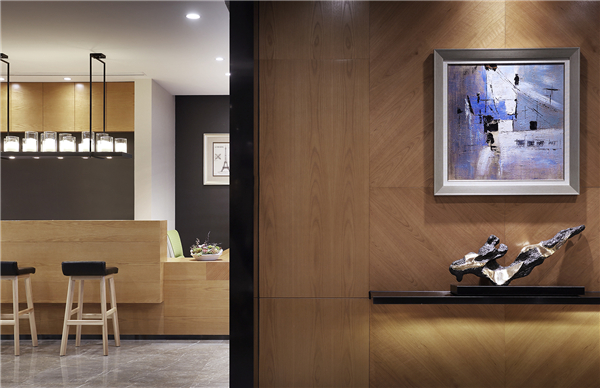 在材料的运用上,设计师选用了一些环保低碳的天然材料,如石材、木,本案中也选用了玻璃、黑钢、地毯等具有浓厚现代气息的用材。空间局部界面的木色运用,不仅温和了空间,它与石材及黑钢等冰冷质地的碰撞,还加强了对比。