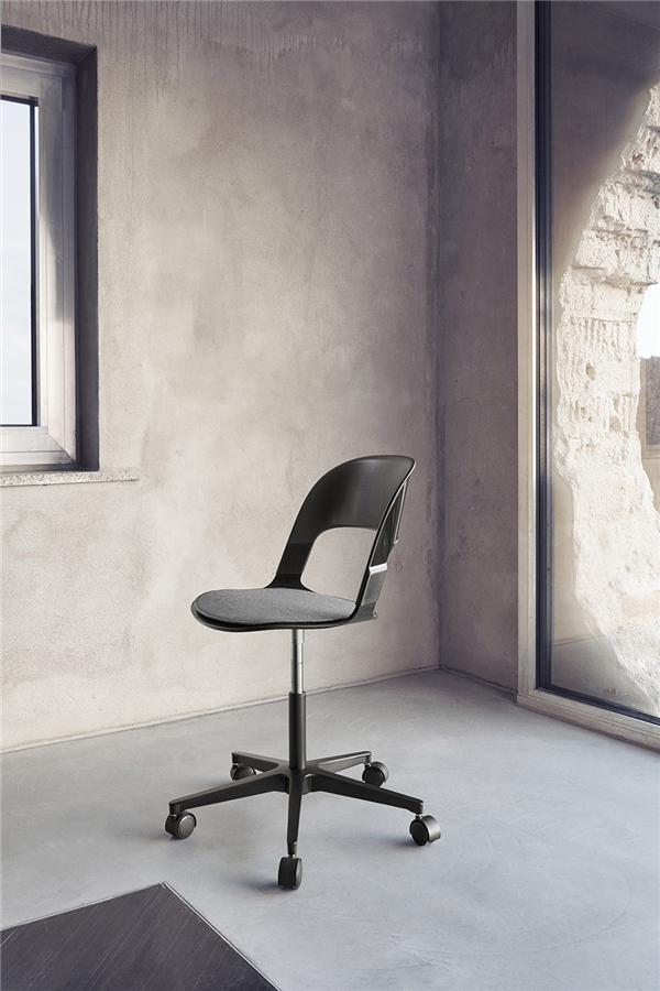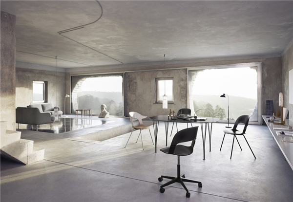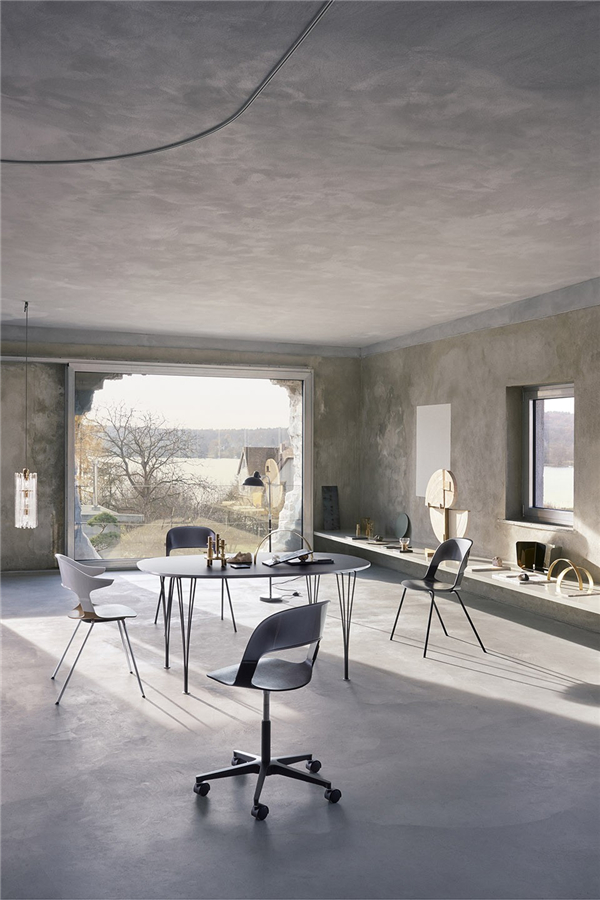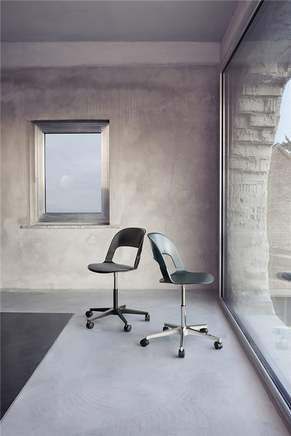座椅将复合板压制成富有流动感的几何形状,体现了Fritz Hansen引领的世纪中期设计语言。设计师将传统材料制成的椅座和聚碳酸酯模块框架结合在一起,新老材料之间产生对比,为品牌添加了新的元素。靠背被做成10%透明度,使塑料材质有了玻璃一般的品质。