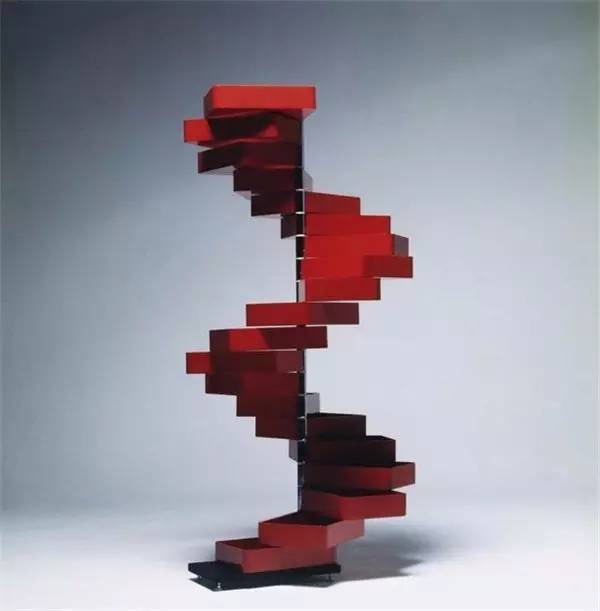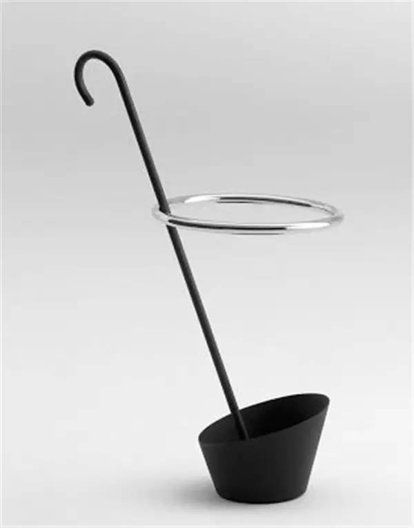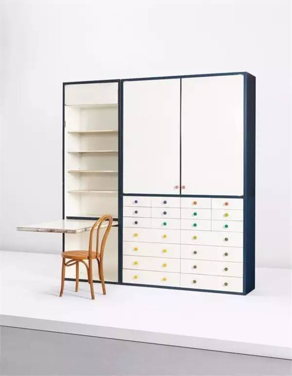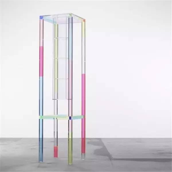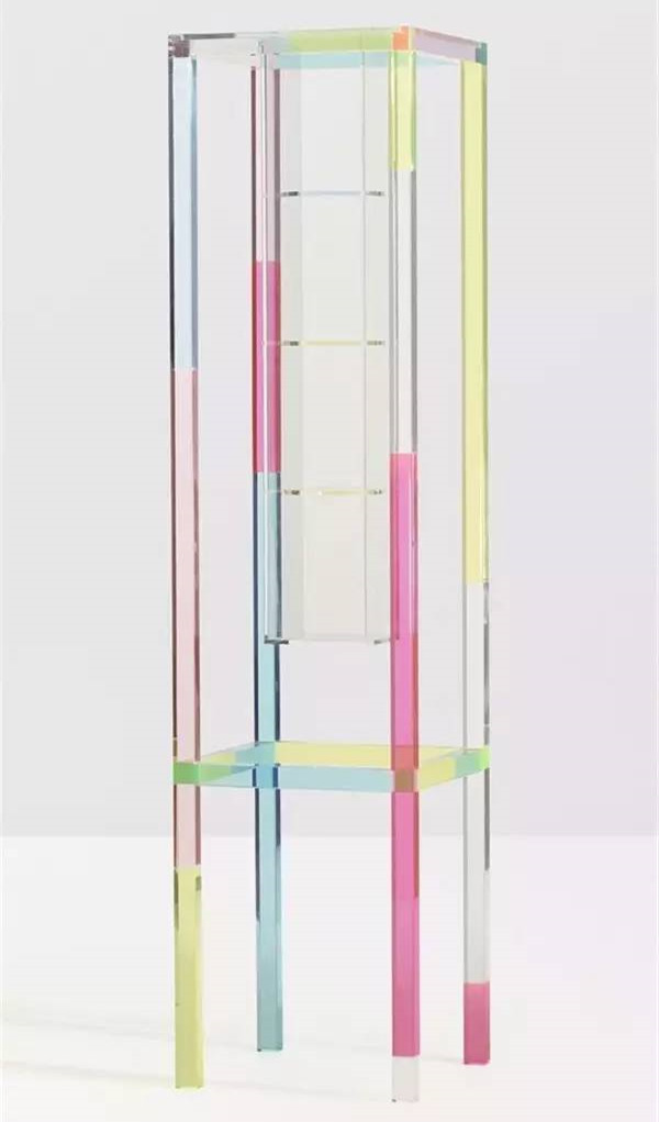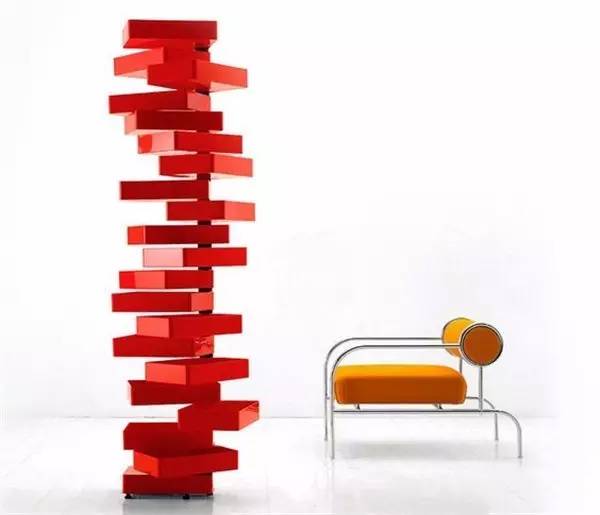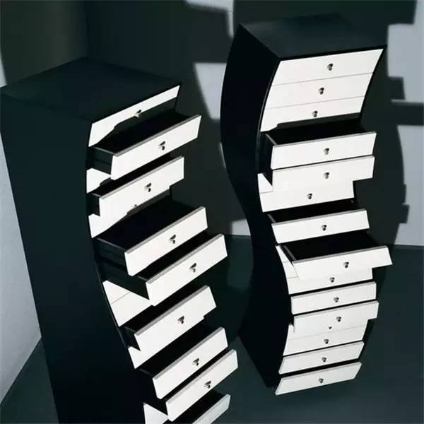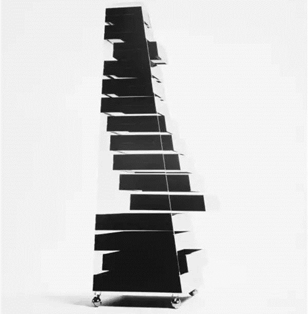 透明的丙烯树脂组成的金字塔形状的架子,层层叠叠的黑色丙烯树脂做成的17个抽屉,远看如同悬在空中,架子可以旋转,因此抽屉拉出的方向时常可以改变,它像是一个现代雕塑作品,新奇却也实用。