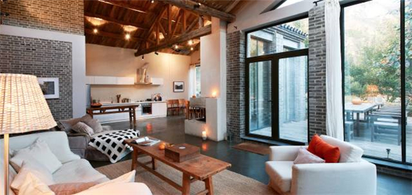 宅院的名字能直接望文生义,没有丝毫牵强附会,“坡上”就在坡上,“半坡”就在半山腰,“山脚下”在山脚下,“老钱家”原来的住户叫老钱,“石房子”是石头垒的,都是当地超过百年的老房改造的。边泡澡边看星星的房间出自“坡上”,娜尔苏喜欢那里,不是为泡澡,“柿子树下晒太阳,看到房子,也能看到山那边的长城,整个感觉都是我想要的”。“坡上”保留了一小部分老房子,新建部分起了两层,室内布置带着娜尔苏熟知的北欧风格,原木茶几、餐桌和椅子,用纯色或图案并不复杂的布艺做衬,所有的门用草席面包裹,一些风格独具的陈设品都是娜尔苏亲自从跳蚤市场淘来的。房间挑顶很高,灰砖加落地玻璃窗让室内阳光明媚。院子里的苹果树硕果累累,随便摘一个,蹭蹭霜就能入口了。坐在柿子树下的娜尔苏沐浴在阳光里的树影斑驳中,点评今年果树的收成:“今年是小年,收成算好,但也没有特别好。往年的苹果要比今年多得多。”