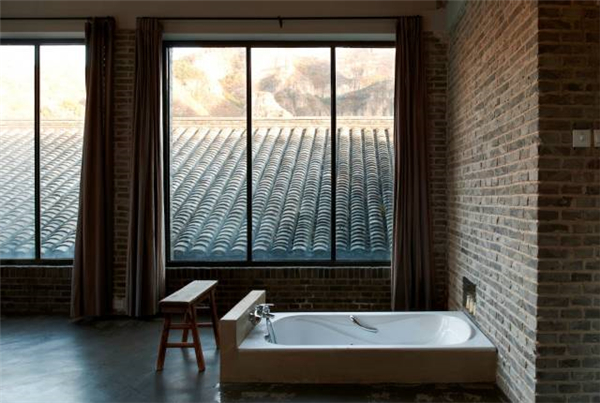 “坡上”的浴室,青砖灰瓦和山谷的景色交相辉映,营造了一个独特而贴近自然的沐浴环境