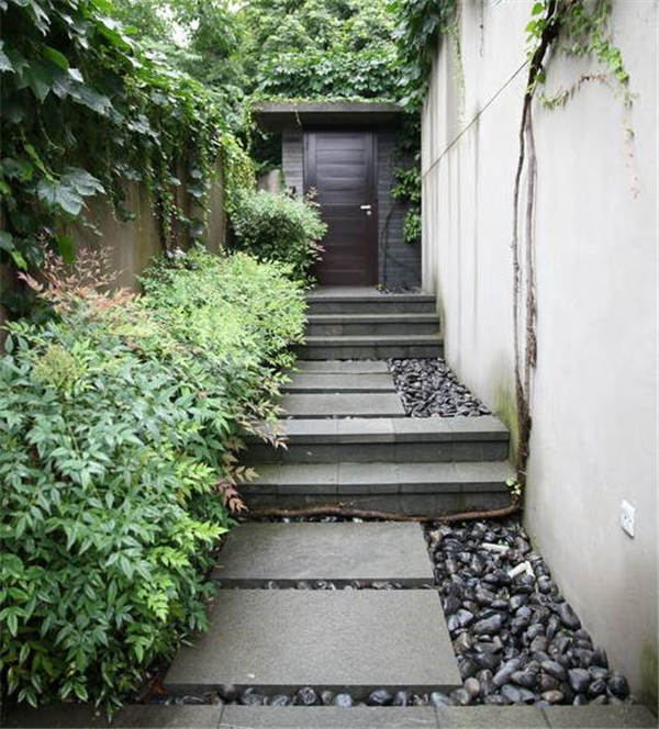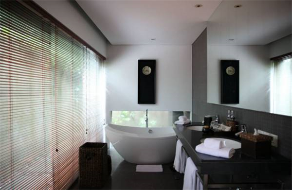 整个室内给人以安静平和的氛围,而大块大块的明丽玻璃引入自然光线及无尽的绿意,使室内的环境丰富多变。起居室和卧室间有一道悠长的玻璃廊道相连。而浴室户外的小径居然还能通向一处户外绿意中的冲淋区,可以尽情享受”天浴“之乐。