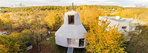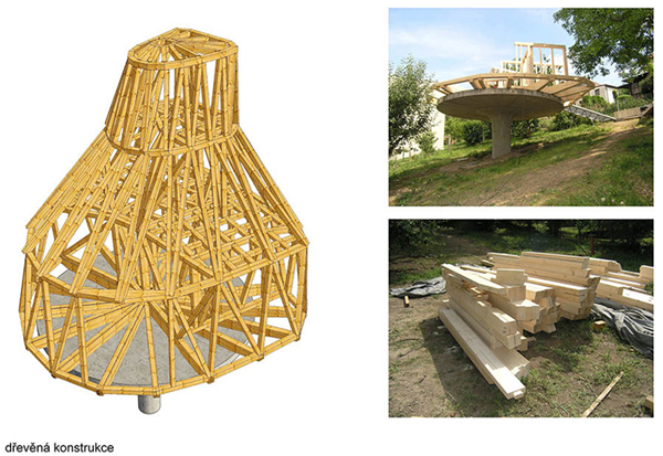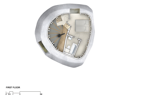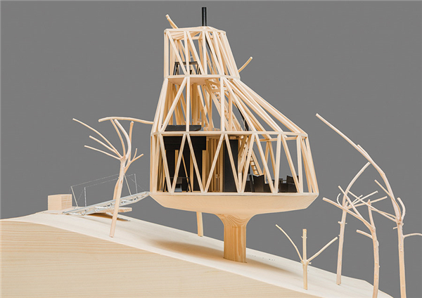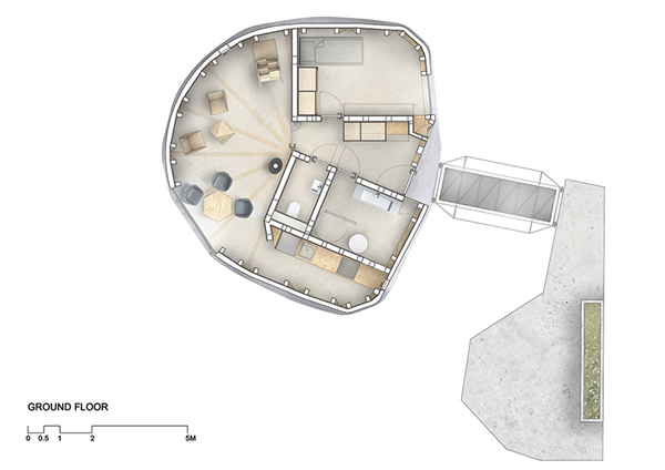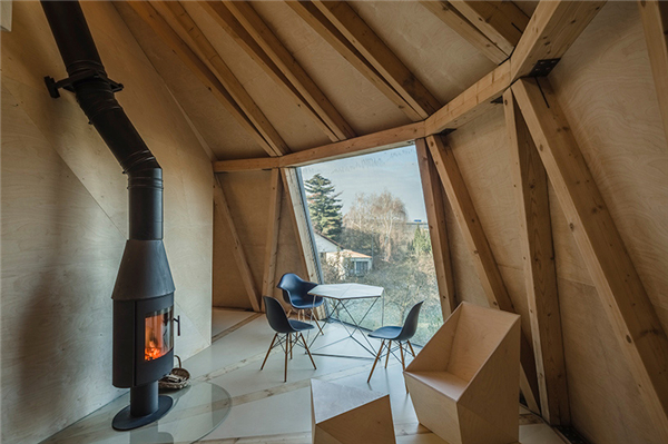 该房子被设计成一座位于单根混凝土上方的木质住宅,其复杂的木质框架全部是通过电脑构建出来的。在现场施工之前,梁已经通过三维铣削机被精确切割出来,这样可以让施工过程更加简单高效。为了确保住宅的结构稳定性,其不规则形状已划分为平面三角形。建筑物的外部立面采用聚氨酯防水并使用防水喷雾保护住宅免受其他因素影响。