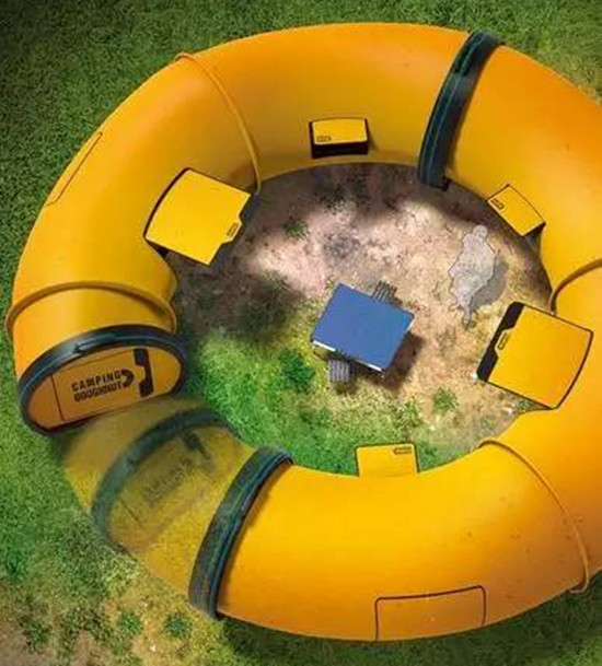 你爱吃甜甜圈?爱去露营?有没有想过将两者结合在一起?韩国设计者Sungha Lim, Hyunmook Lim和 Han Kim为我们带来一款外形酷似甜甜圈的帐篷(Camping Doughnut),前所未见。它看似巨大,可折叠起来方便运输。它由两截组成,内含六个隔开空间,适合2-4人豪华出行,可以根据需要任意选择拼接方式。
