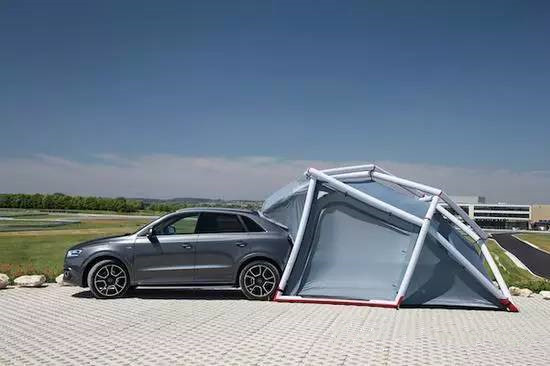 来自德国的户外用品设计公司Heimplanet为奥迪Q3 Quattro开发了一款充气野营帐篷,不用时收纳到车顶行李架上,使用时摊开,只需7 分钟即可完成充气、组装。这款帐篷用充气柱子支撑,每根柱子各自独立,充气之后可以和汽车后备箱相连,给司机和乘客提供一个更宽敞的休息场所。
