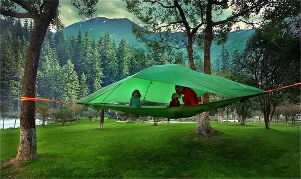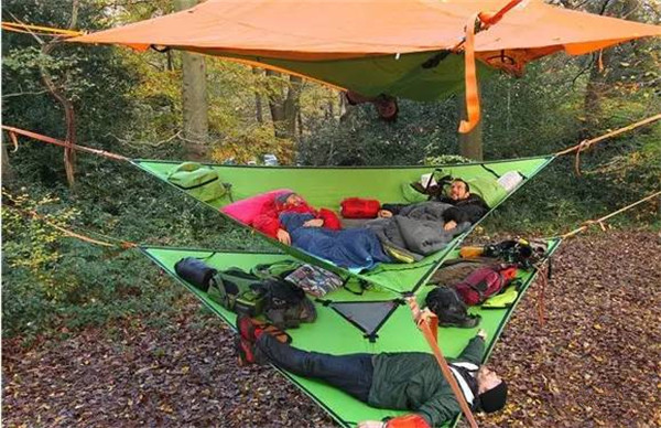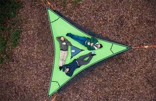 它其实就是一个帐篷,可容纳下三人,既可以当普通帐篷使用,也可以能像吊床那样安装在树上,只需有三棵树成三点固定。该帐篷采用防水、防紫外线和防火阻燃的材料制成,非常舒适,你可以带着它去探索任何一片广阔的森林或海滩。Tentsile公司还设计了一些配件,如遮雨棚、防蚊网等。