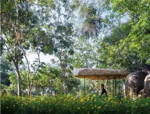 石头与钢结构碰撞在森林之中显得十分禅意,事实上,设计师想让这个空间延续佛教2600年前坐落尼泊尔菩提树下之精神。