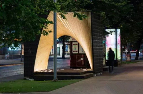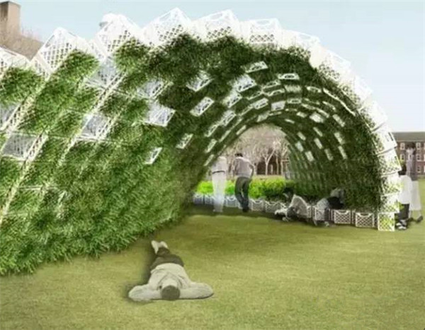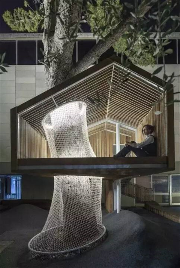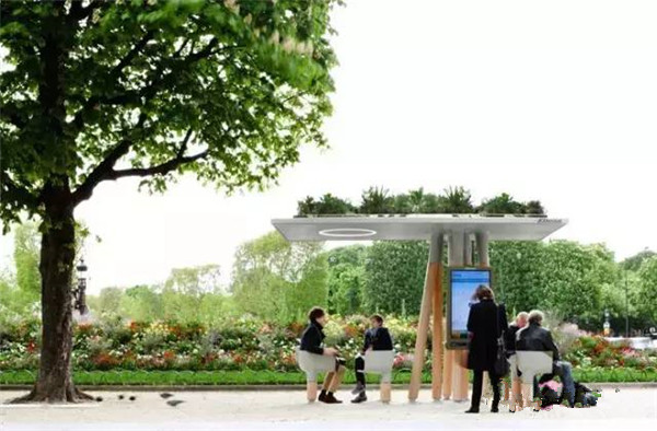 这个智能数字站不仅能遮阳还提供WIFI能供人休息学习,整个造型像是树桩托起一个花园