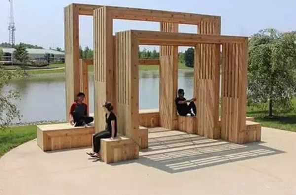 这个亭子是一个“人与人”互动的舞台材质的对比、曲与直的对比,都突显场地的气氛