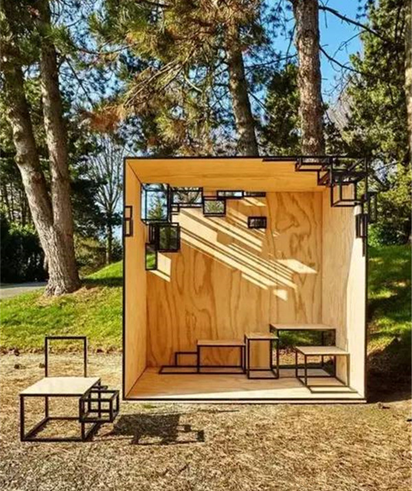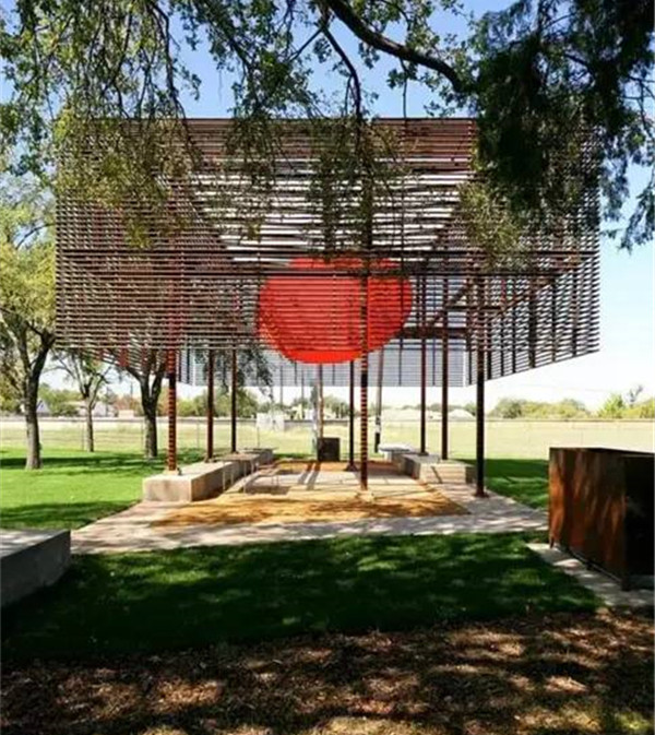 看似是简单的挡雨棚但颜色的运用和特殊的形状使得这个亭子别有一番韵味