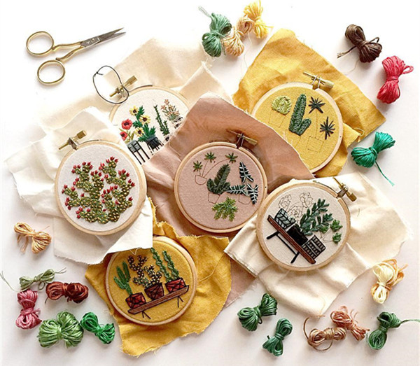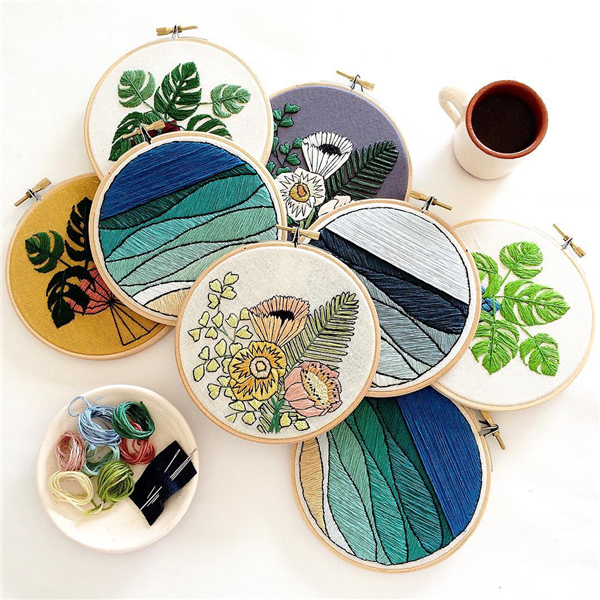 Benning的创作灵感大多来自植物,不同颜色、粗细的棉线被一针针镶嵌到大大小小的圆形布面上,变成了一幅幅生动立体的装饰图案。